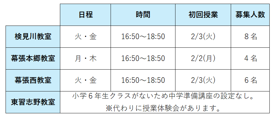 中学準備講座だけの受講も可能。全12回。日時は以下の通りです。